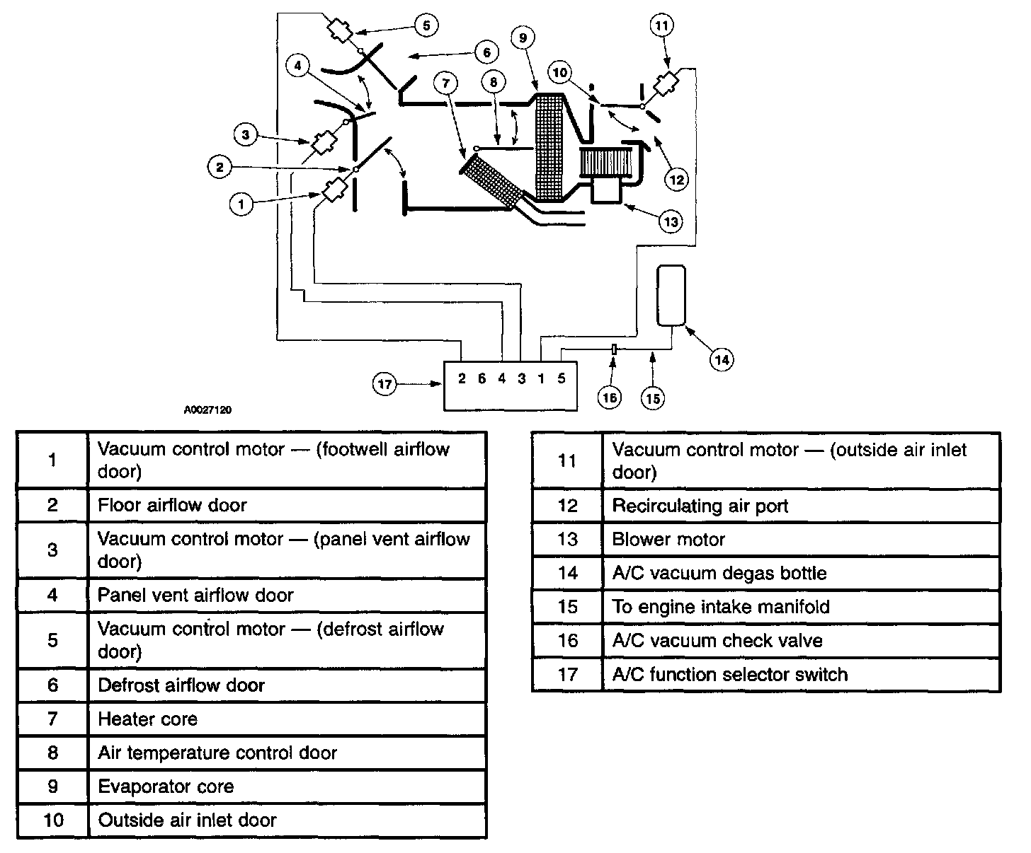 NOTE: A leak in the vacuum control circuits will send all airflow to the defroster outlets. This condition may occur during acceleration indicating a slow leak, exist at all times indicating a large leak, or it may exist only when specific functions are selected indicating a leak in that portion of the circuit.
