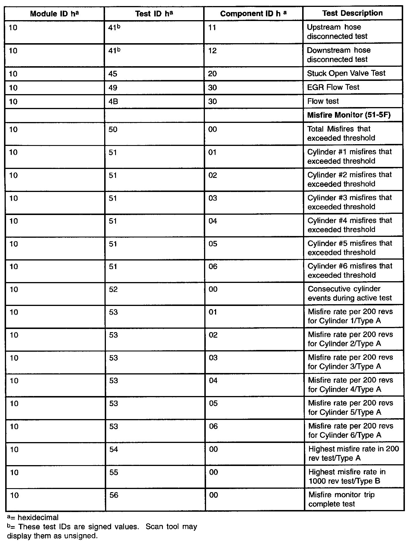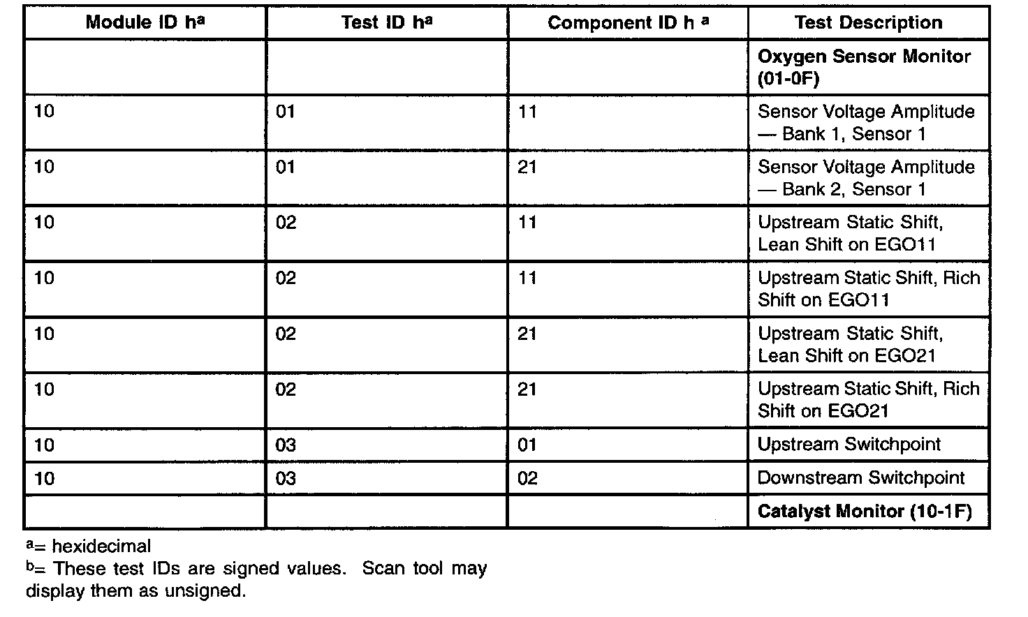 The purpose of this test mode is to allow access to the results of OBD II monitor diagnostic test results. The test values that are stored at the time of the particular monitor completion are displayed when the particular test identification is requested. Refer to the table for test information.