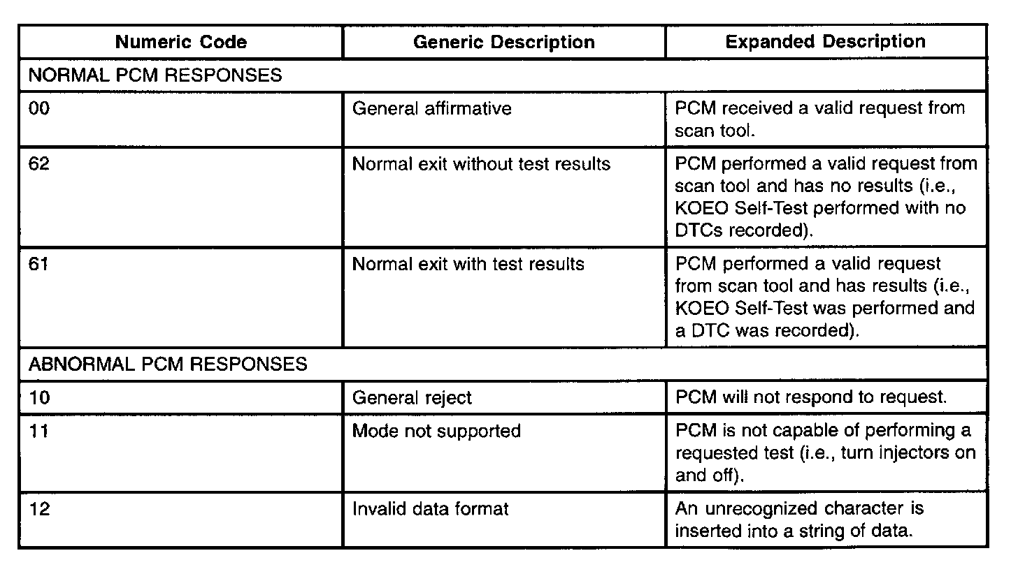 It is possible to receive a communication error from a NGS Tester when initiating a diagnostic test or accessing PIDs. The communication error can be caused by operator error, the vehicle wiring, connectors, the PCM or other control modules connected to the DLC wiring. The PCM will respond to a NGS Tester whenever the tool requests a test. These are not DTCs. Listed in the table are numeric codes and generic descriptions that a scan tool may display when trying to perform some PCM operations. It is possible to get other numeric codes not listed. For a complete list of communication response codes, Refer to Society of Automotive Engineers (SAE) document J2190 enhanced E/E Diagnostic Test Modes. Some are normal responses to valid requests. The others are communication error responses. If the tool displays any of the communication error responses check scan tool connections, cable/adapters and entry of vehicle information.