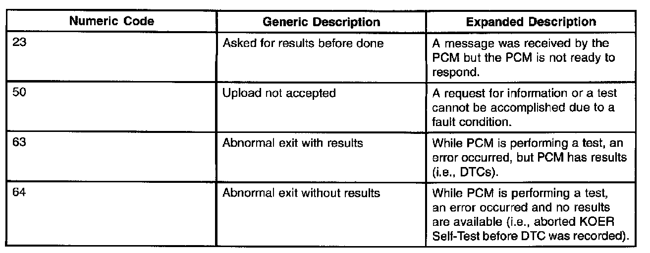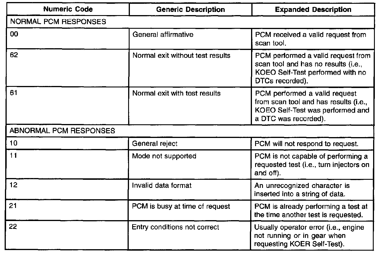 It is possible to receive a communication error from a WDS or equivalent Tester when initiating a diagnostic test or accessing PIDs. The communication error can be caused by operator error, the vehicle wiring, connectors, the PCM or other control modules connected to the DLC wiring. The PCM will respond to a WDS or equivalent Tester whenever the tool requests a test. These are not DTCs. Listed are numeric codes and generic descriptions that a scan tool may display when trying to perform some PCM operations. It is possible to get other numeric codes not listed. For a complete list of communication response codes, Refer to Society of Automotive Engineers (SAE) document J2190 enhanced E/E Diagnostic Test Modes. Some are normal responses to valid requests. The others are communication error responses. If the tool displays any of the communication error responses check scan tool connections, cable/adapters and entry of vehicle information.