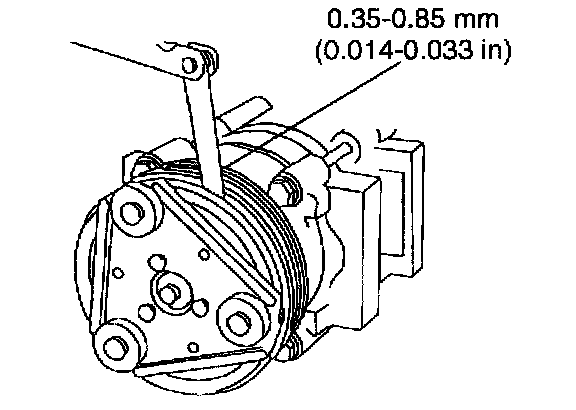 3. Add or remove spacers between the A/C clutch and the A/C clutch and the compressor shaft until clearance is within specification (0.35 - 0.85 mm, 0.014 - 0.033 in.).