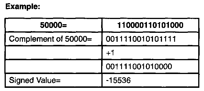 The conversion is done as follows: If the value is > 32767 then complement (change 0's to 1's and 1's to 0's), add 1 and a negative sign.