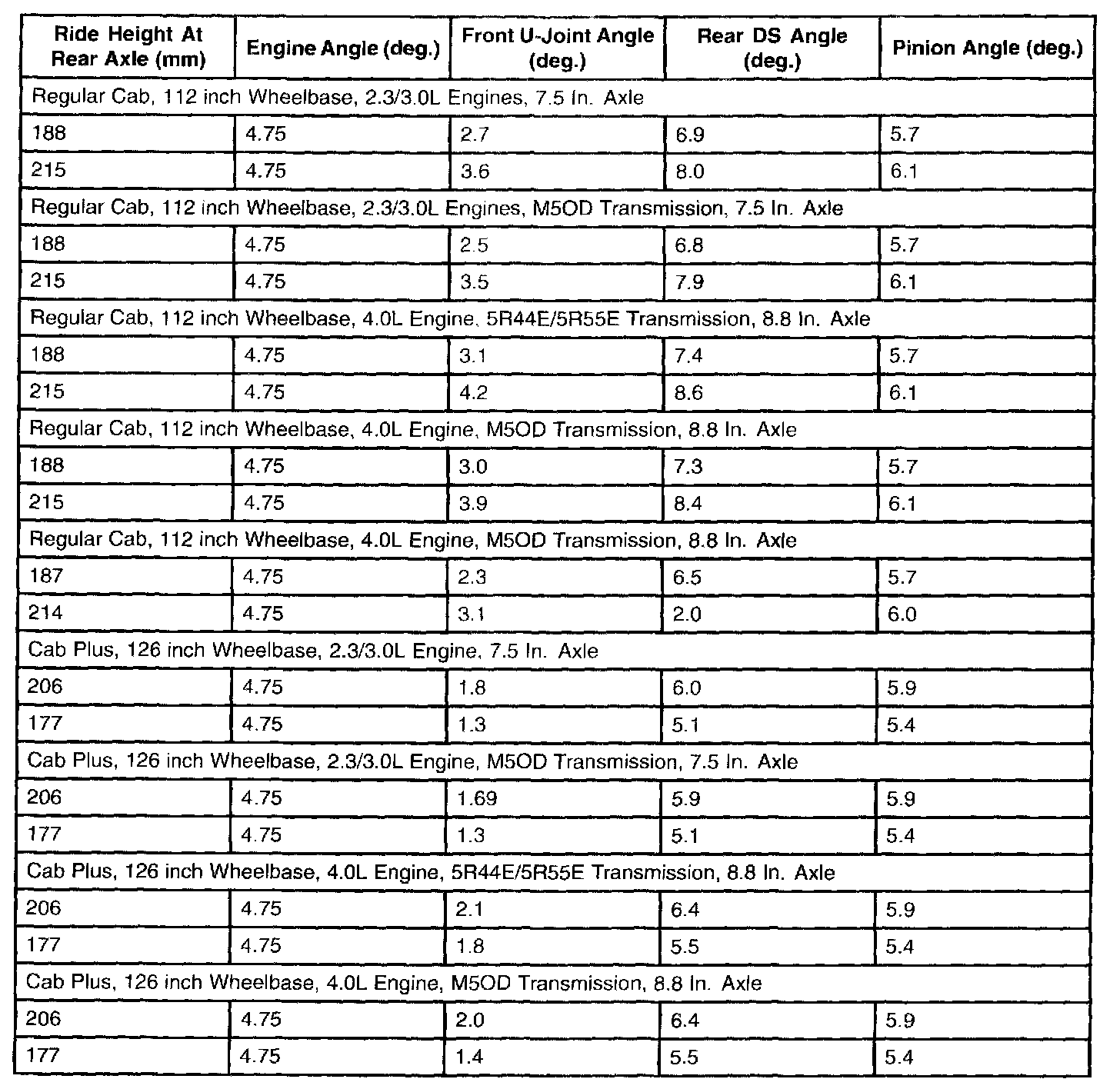 Rear Driveline Angles @ Curb (4X2) Specifications