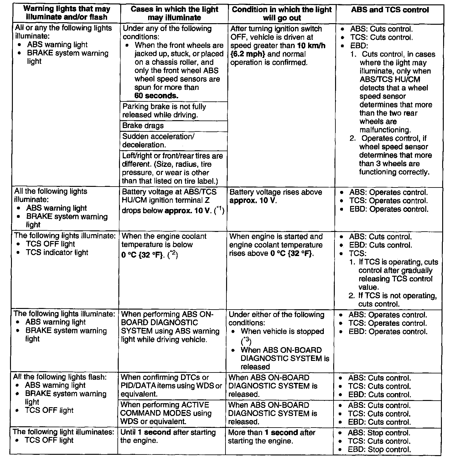 1. The ABS warning light, BRAKE system warning light, TCS indicator light and/or TCS OFF light illuminate even when the system is normal.