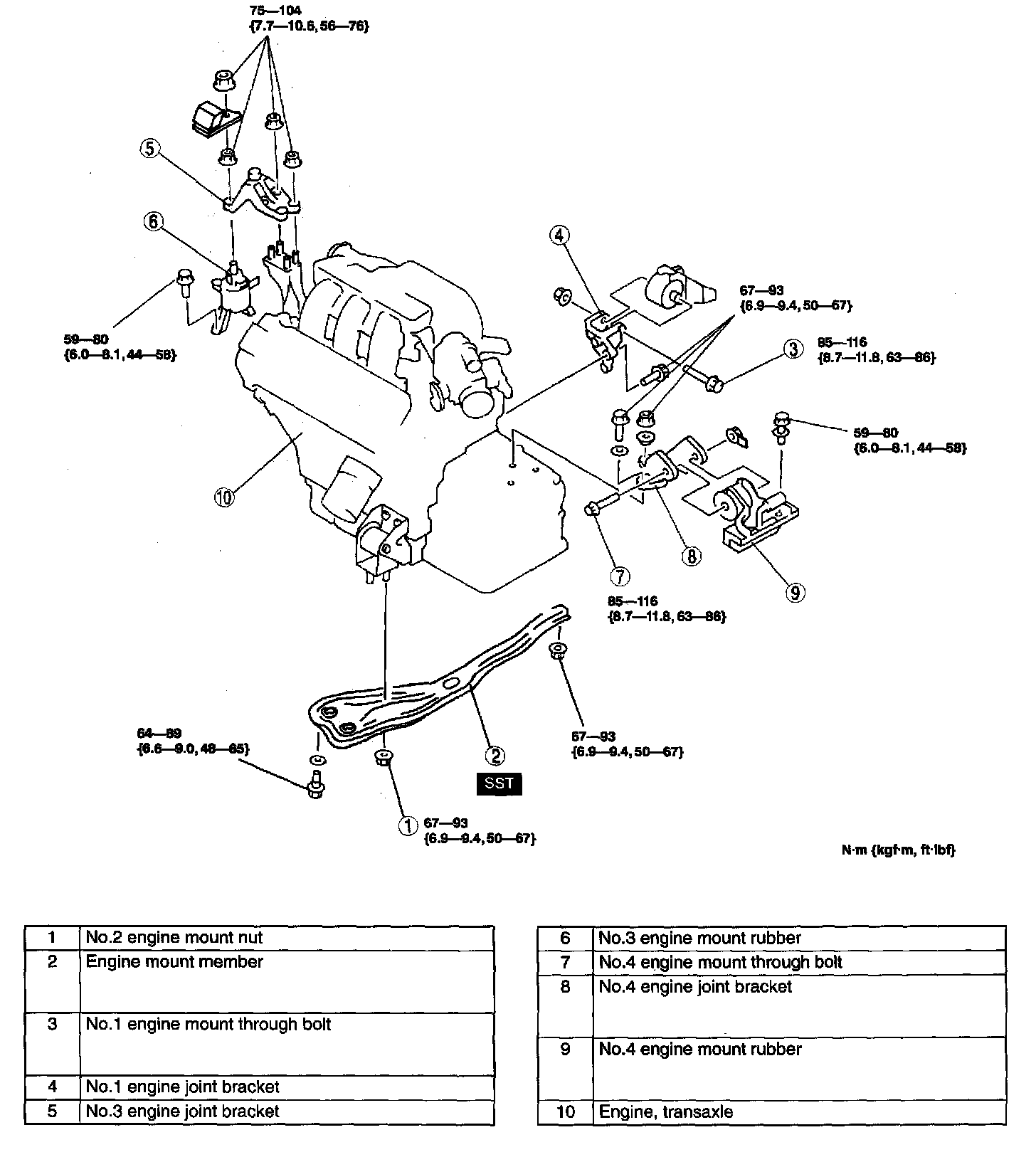 4. Tighten the No. 1 and No. 4 engine mount through bolts.