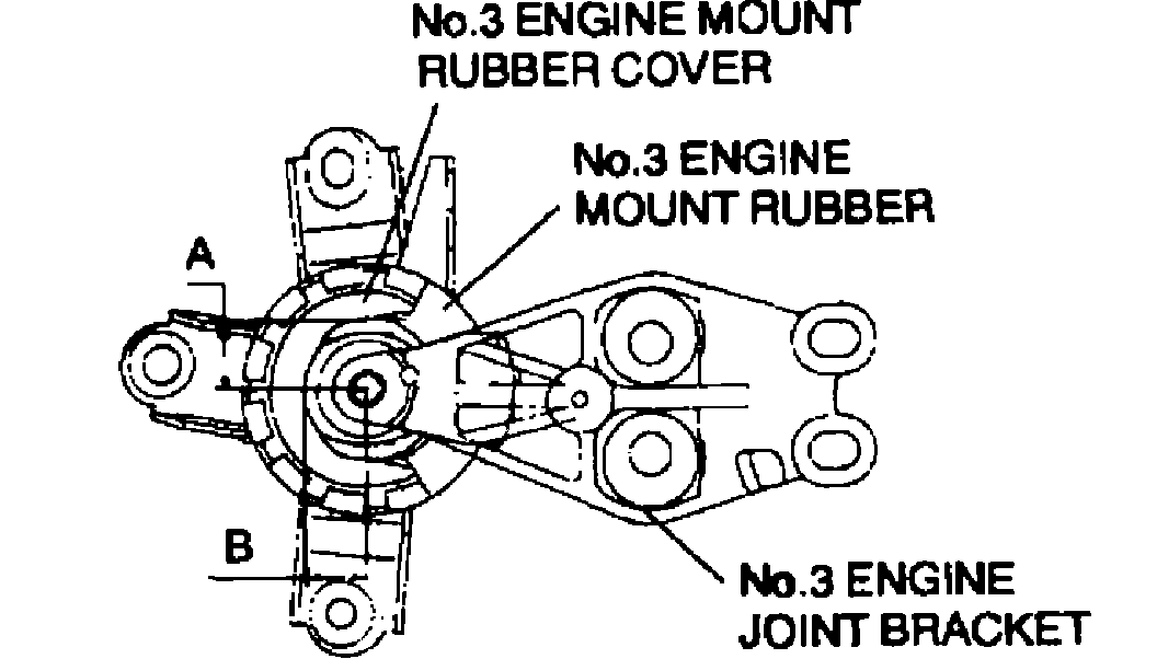 3. Before tightening the No. 1 and No. 4 engine mount through bolts to fix the engine, position the engine so that the clearances A and B of the No. 3 joint bracket are approximately within the specifications.