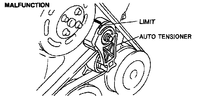 1. Verify that the drive belt auto tensioner indicator mark does not exceeds the limit.