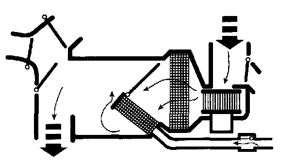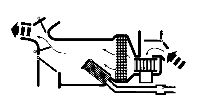 - The air inlet blend door is set at no vacuum, blocking the recirculation passage and admitting outside air.