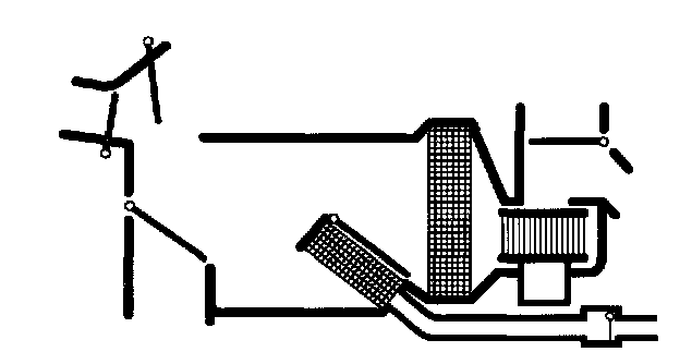 - The defrost airflow door is at full vacuum, closing off airflow to the windshield defroster hose nozzle and directing airflow to the heater outlet footwell duct.