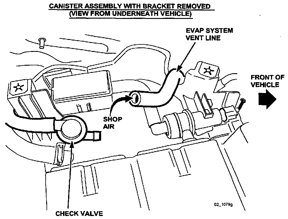 a. Disconnect the vent line in the evaporative emissions system from the check valve side. This connection is located just forward of the evaporative emissions canister assembly, underneath the vehicle in the area of the driver side rear seat.