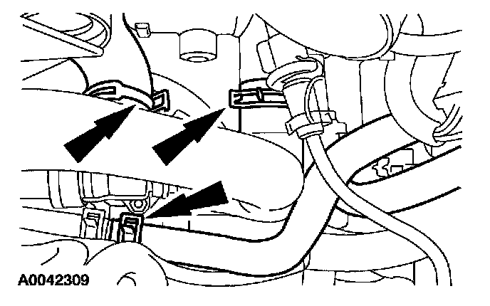 4. Disconnect the three hoses and position the thermostat aside.
