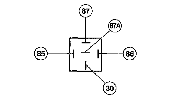Check for the continuity between terminal 85 and all other terminals. If the resistance is 5 ohms or less between terminal 85 and any other terminal, replace the relay. If the resistance is greater than 5 ohms, continue with the test. Use two jumper wires to connect relay terminals 86 and 30 directly to the positive battery terminal. Check for voltage at terminal 87A. If battery voltage is not indicated, replace the relay. If battery voltage is indicated, connect a third jumper wire to terminal 85, and ground the jumper wire to a known good ground. Check for voltage at terminal 87. If battery voltage is not indicated, replace the relay.