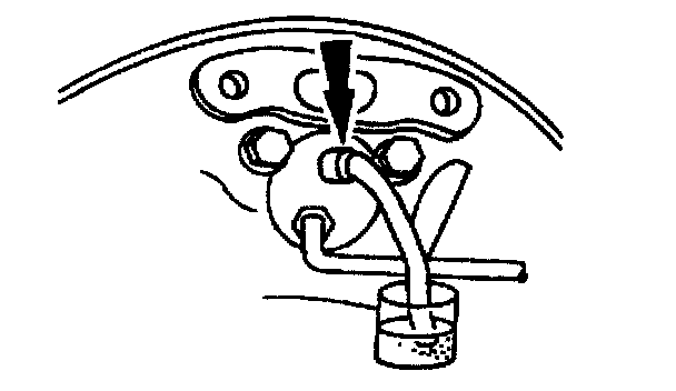7. Place a box end wrench on the RH front disc brake caliper bleeder screw. Attach a rubber drain tube to the RH front disc brake caliper bleeder screw, and submerge the free end of the tube in a container partially filled with clean brake fluid.