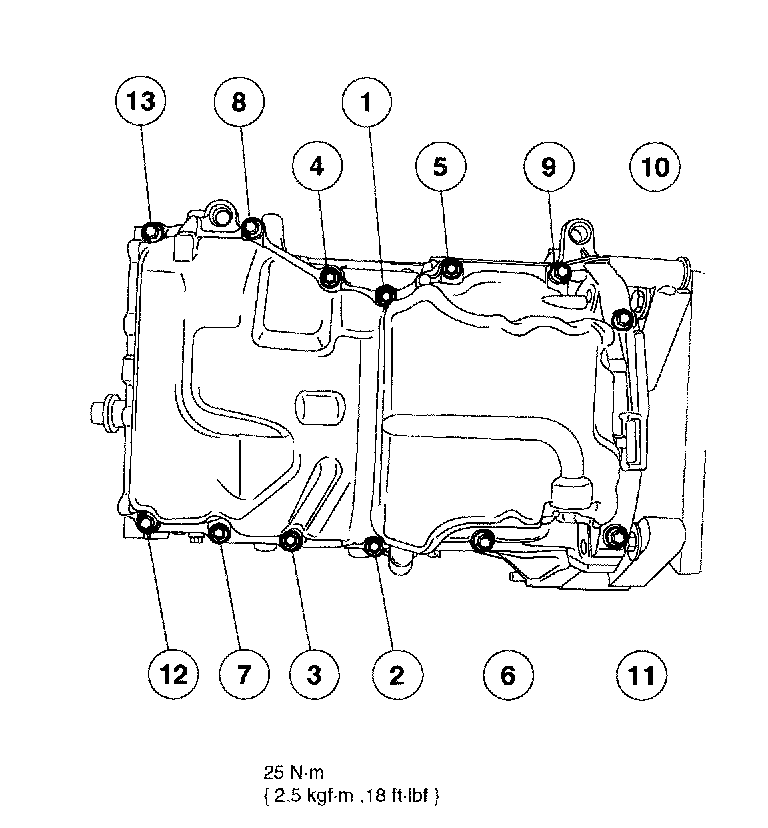 7. Apply a 2.5 mm bead of silicone gasket and sealant to the oil pan. Install the oil pan. Tighten the bolts in the sequence shown.