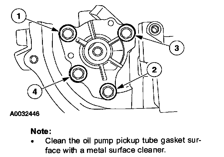 5. Install a new oil pump pickup tube gasket and the pickup tube. Tighten the bolts in the sequence shown.