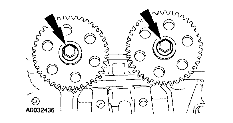 18. Install the camshaft sprockets and the bolts. Do not tighten the sprocket bolts at this time.
