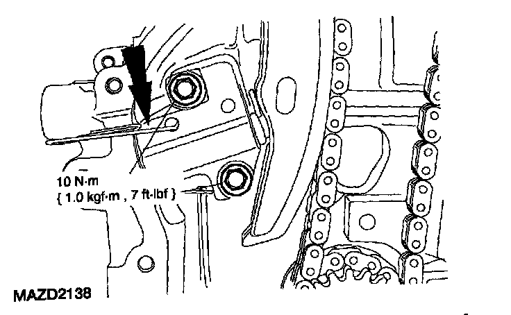 25. Install the timing chain tensioner. Remove the paper clip to apply tension to the timing chain.