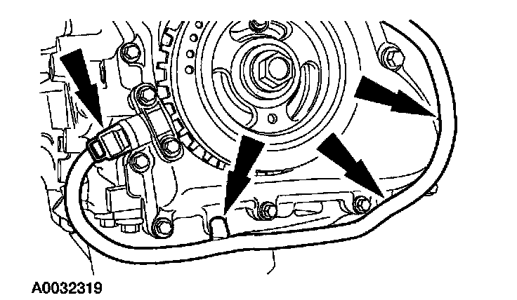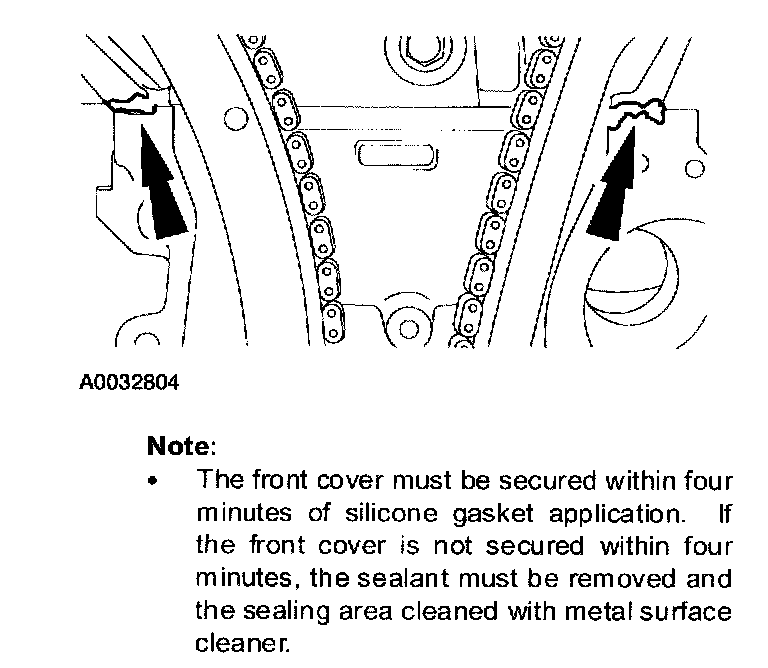 ^ The front cover must be secured within four minutes of silicone gasket application. If the front cover is not secured within four minutes, the sealant must be removed and the sealing area cleaned with metal surface cleaner.