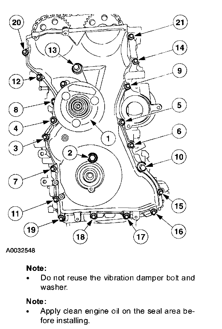 31. Install the front cover. Tighten the bolts in the sequence shown in three stages.