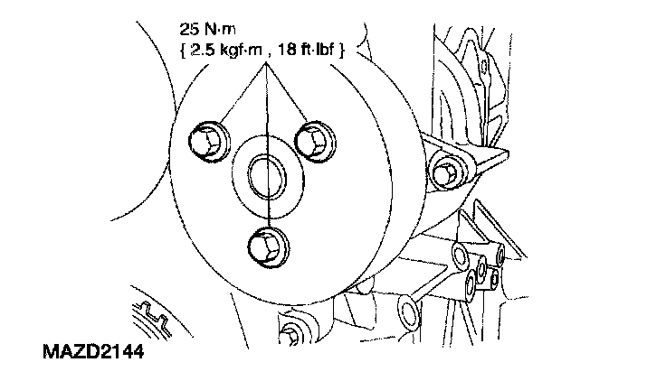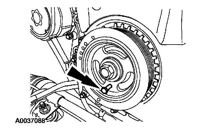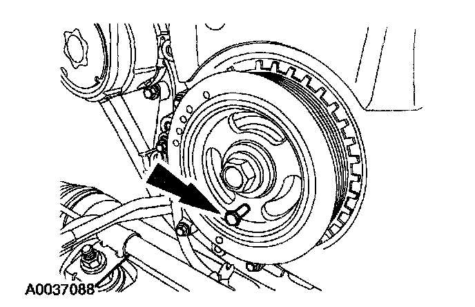 ^ Rotate the crankshaft pulley as necessary to align the bolt holes.