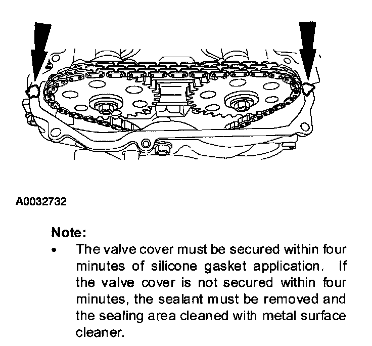 ^ The valve cover must be secured within four minutes of silicone gasket application. If the valve cover is not secured within four minutes, the sealant must be removed and the sealing area cleaned with metal surface cleaner.