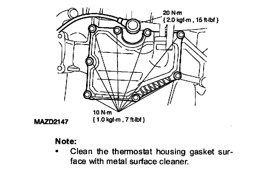 ^ Clean the thermostat housing gasket surface with metal surface cleaner.