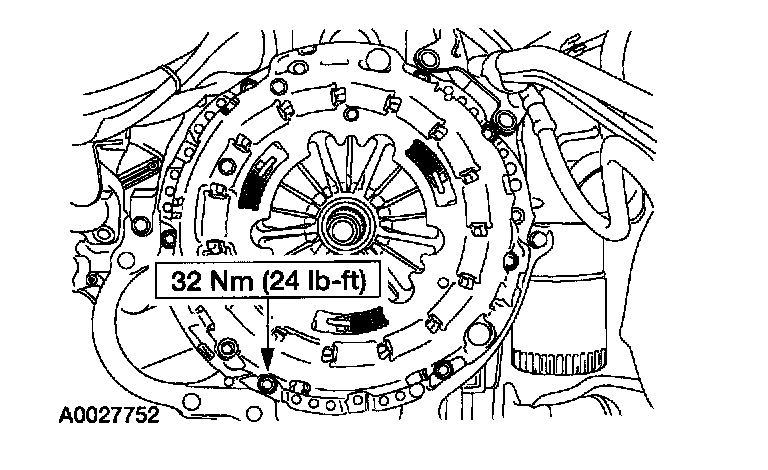 ^ If reusing the clutch pressure plate and flywheel, align the marks made during removal.