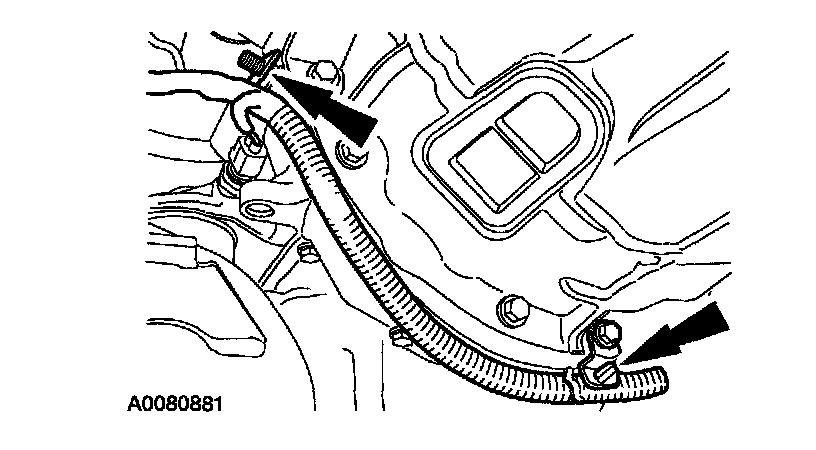 13. Disconnect the Powertrain Control Module (PCM) electrical connector. Remove the retaining nut on the harness clamp. Position the harness on the engine.