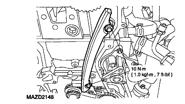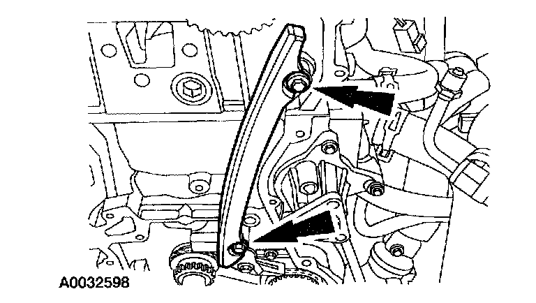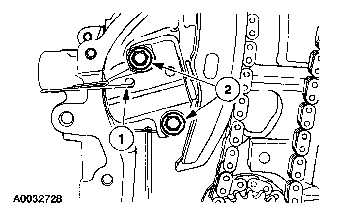 7. Install the timing chain tensioner and the bolts. Remove the paper clip to release the piston.