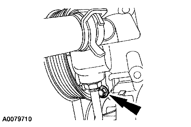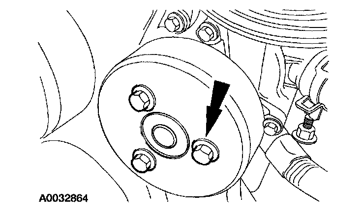 ^ There is one bolt behind the cooling fan drive pulley. This bolt can be accessed by lining up one of the holes in the pulley with the bolt.