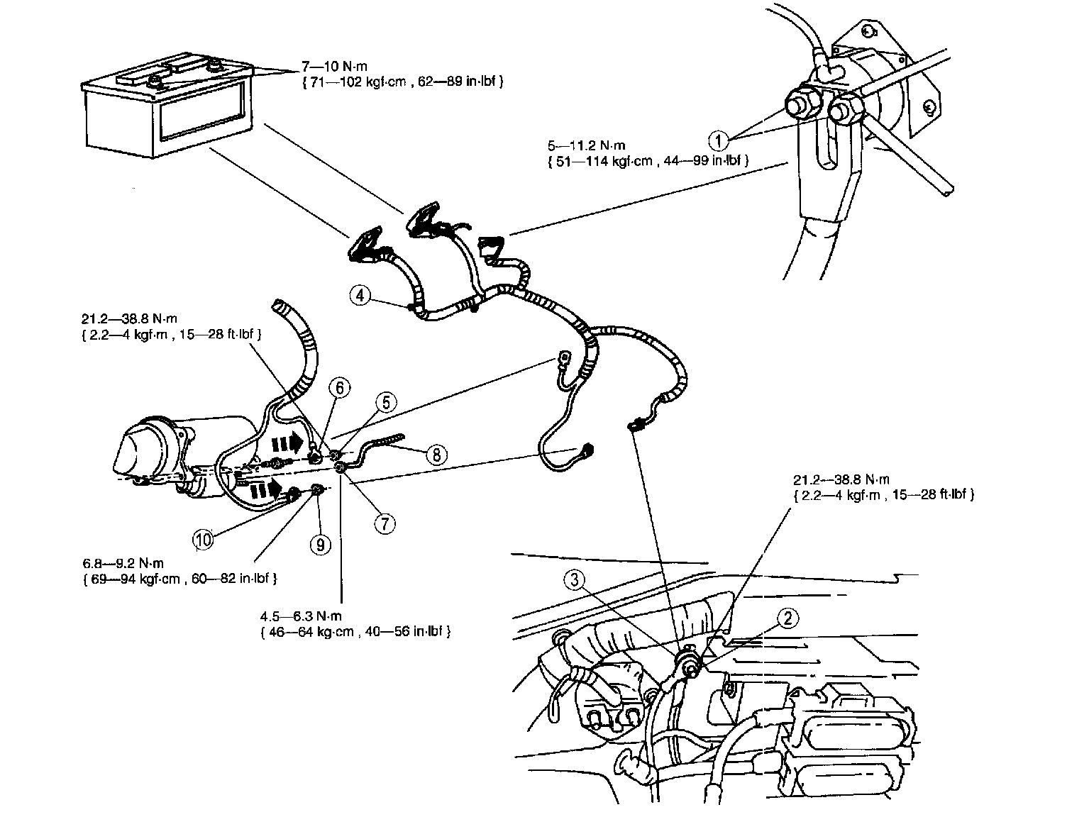 - Remove the starter motor ground cable nut (5) and disconnect the starter motor ground cable (6).
