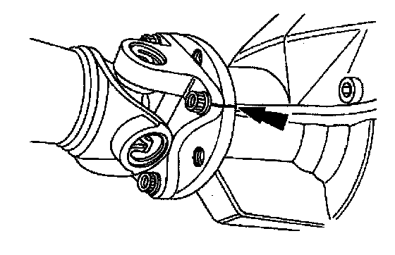 ^ Align the propeller shaft yoke and the axle shaft marks made at removal to maintain driveline balance.