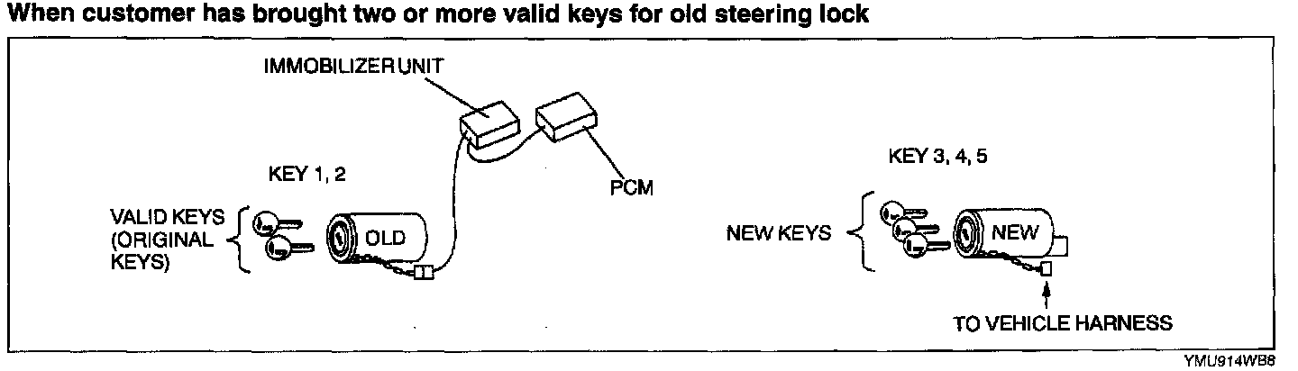 - To make a copy of the key or replace the immobilizer system component parts (the key(s), steering lock, immobilizer unit and/or PCM), the customer should bring all keys to the dealer. This is because the previously programmed key IDs are erased when reprogramming the key IDs into the immobilizer unit and PCM.