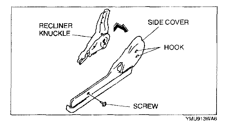 2. Lift the side cover up in the direction shown by the arrow, then unhook it from the recliner knuckle.