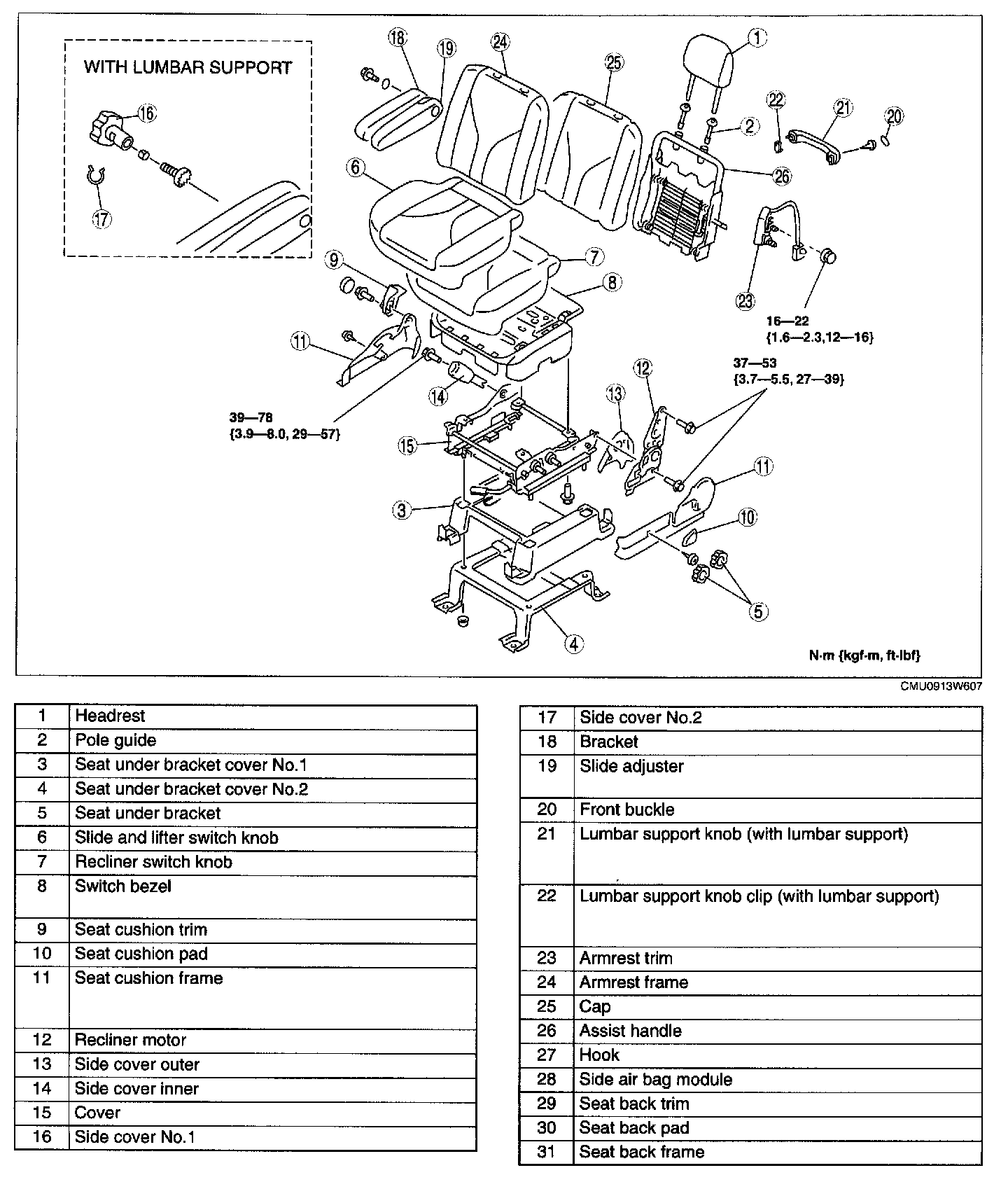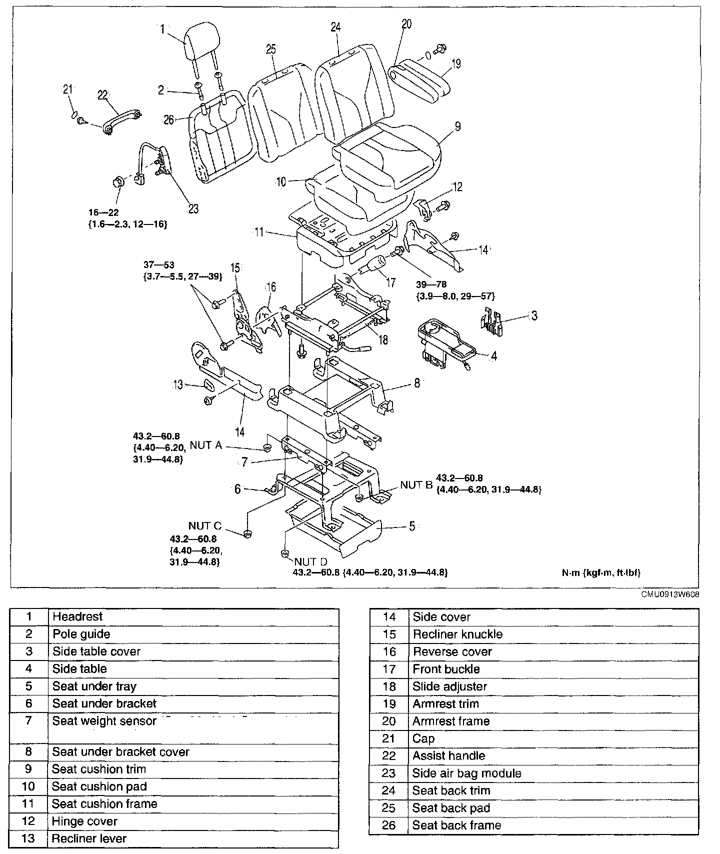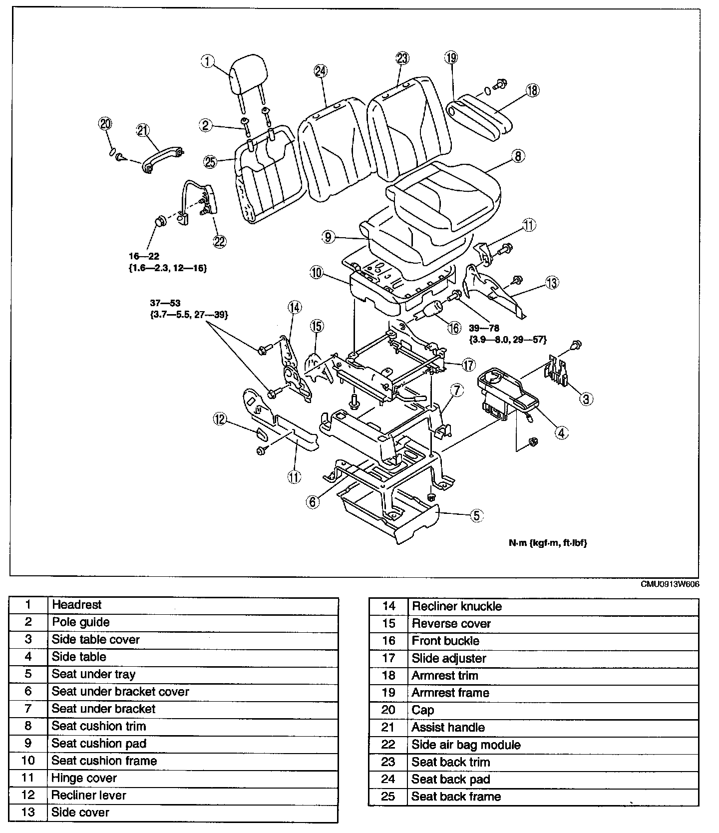 FRONT SEAT DISASSEMBLY/ASSEMBLYWARNING: Handling the front seat (side air bag, seat weight sensor) improperly can accidentally deploy the side air bag, which may seriously injure you. Read the service warnings and cautions before handling the air bag module.