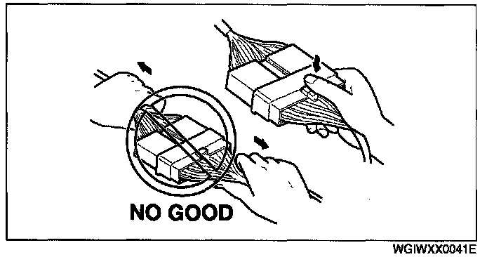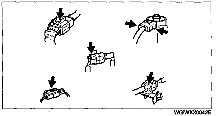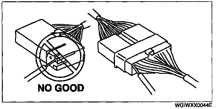 - When a tester is used to inspect for continuity or measuring voltage, insert the tester probe from the wiring harness side.