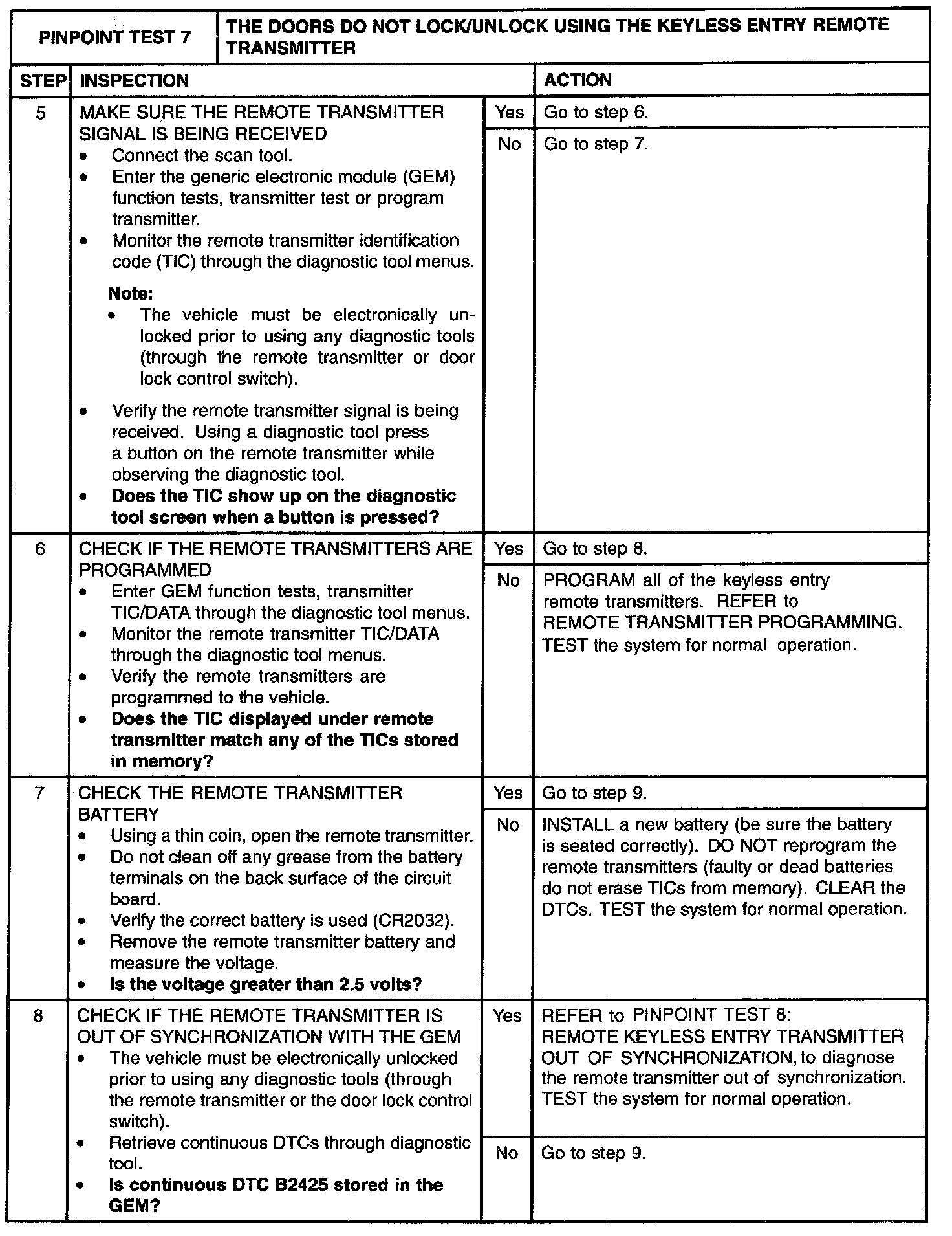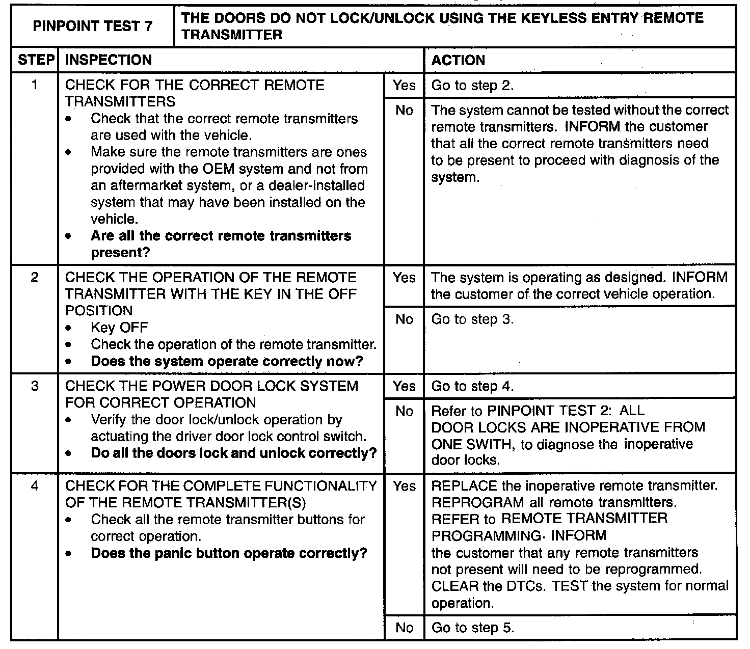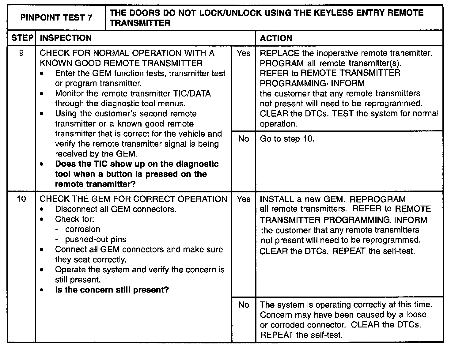 PINPOINT TEST 7: THE DOORS DO NOT LOCK/UNLOCK USING THE KEYLESS ENTRY REMOTE TRANSMITTER