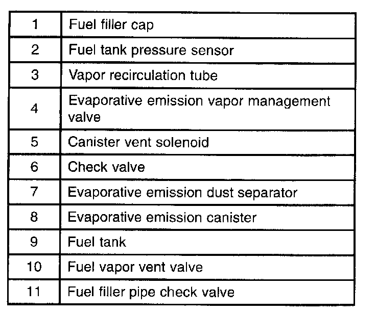 The fuel vapor control valve is normally between the EVAP canister and the fuel vapor vent valve. Its function is to prevent the flow of liquid fuel into the EVAP canister or up to the vapor management valve during refueling, and to prevent the collection of liquid fuel in the fuel vapor hoses by overfilling the fuel tank.