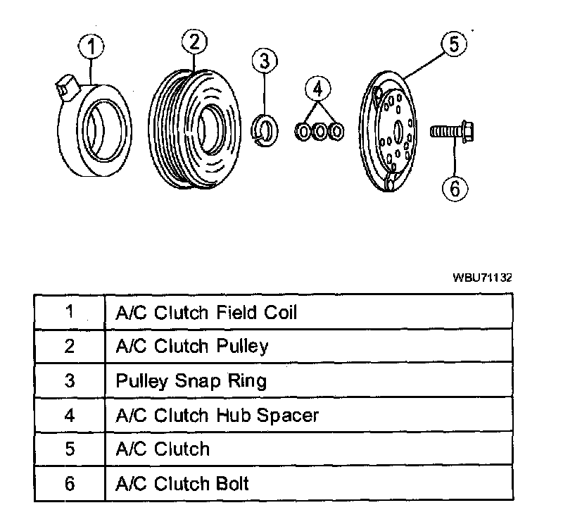 - When the battery positive voltage (B+) is applied to the A/C clutch field coil, the clutch plate and hub assembly is drawn toward the A/C clutch pulley.