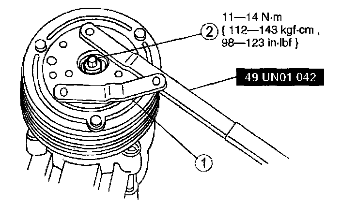 1. Hold the A/C clutch hub with the Spanner Wrench ST49-UN01-042.