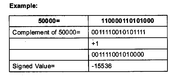 The conversion is done as follows: If the value is > 32767 then complement (change 0's to 1's and 1's to 0's), add 1 and a negative sign.
