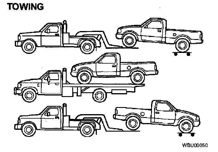 Before the vehicle is towed on its front wheels, release the parking brake and put the gearshift (both manual and automatic) in N (Neutral). If the transmission is malfunctioning, place the front wheels on dollies or disconnect the front propeller shaft. If the transfer case is malfunctioning, disconnect the front propeller shaft from the axle and secure or place the front wheels on dollies.