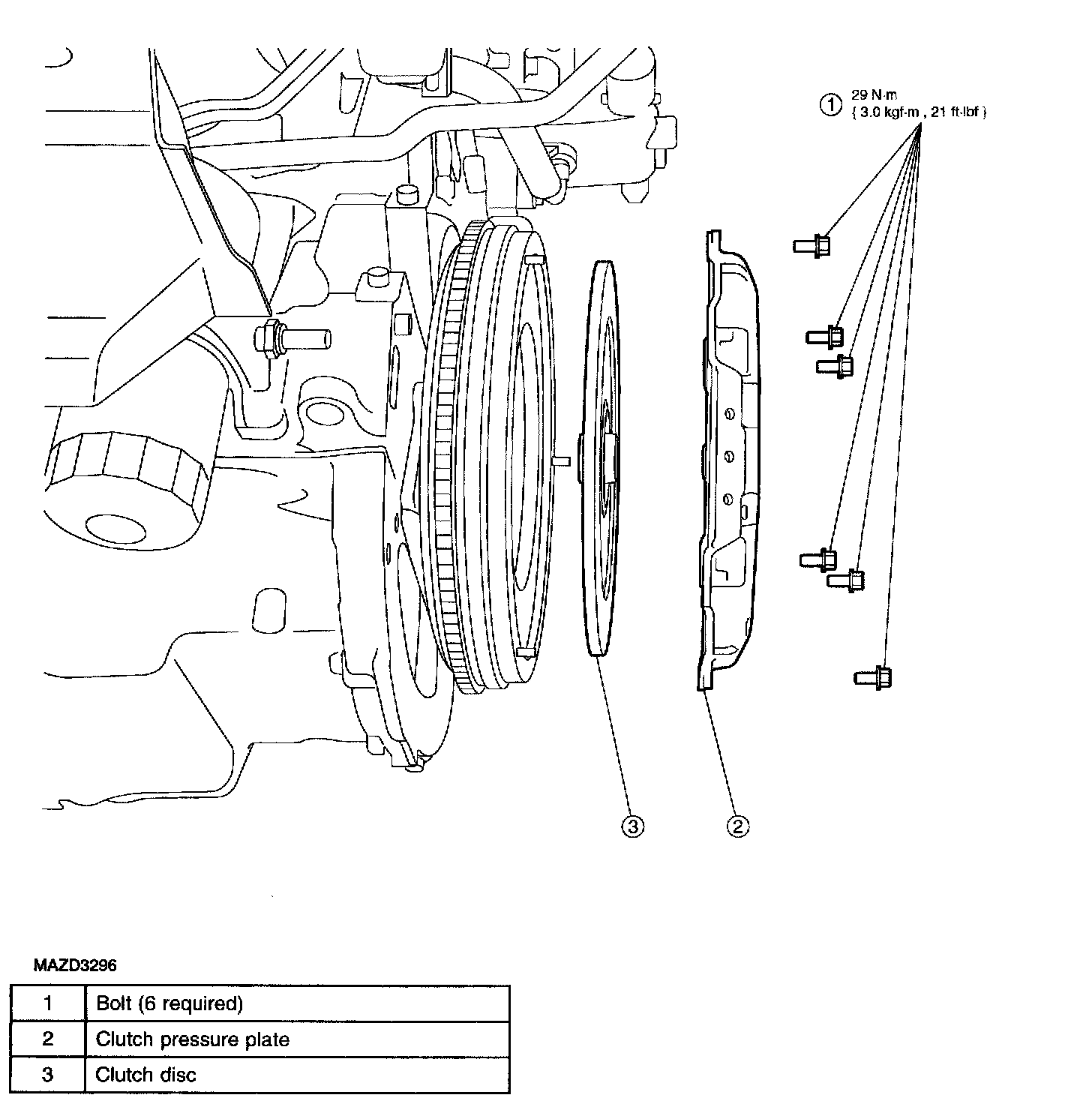 3. Remove the bolts, clutch pressure plate and clutch disc.