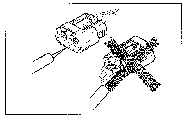 - When a tester is used to inspect for continuity or measuring voltage, insert the tester probe from the wiring harness side.