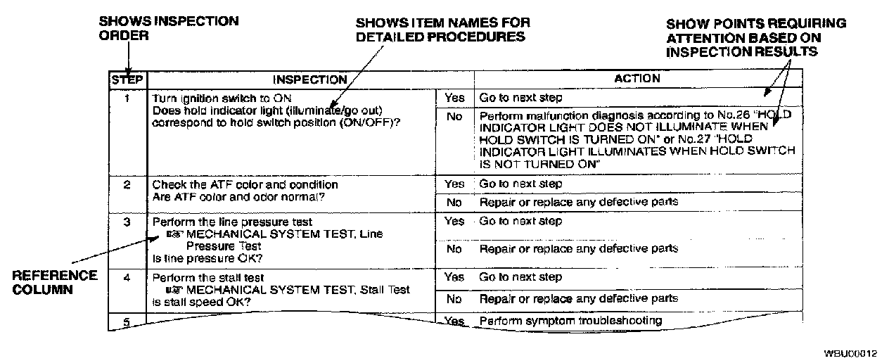 - Symptom troubleshooting shows diagnostic procedures, inspection methods, and proper action to take for each trouble symptom.