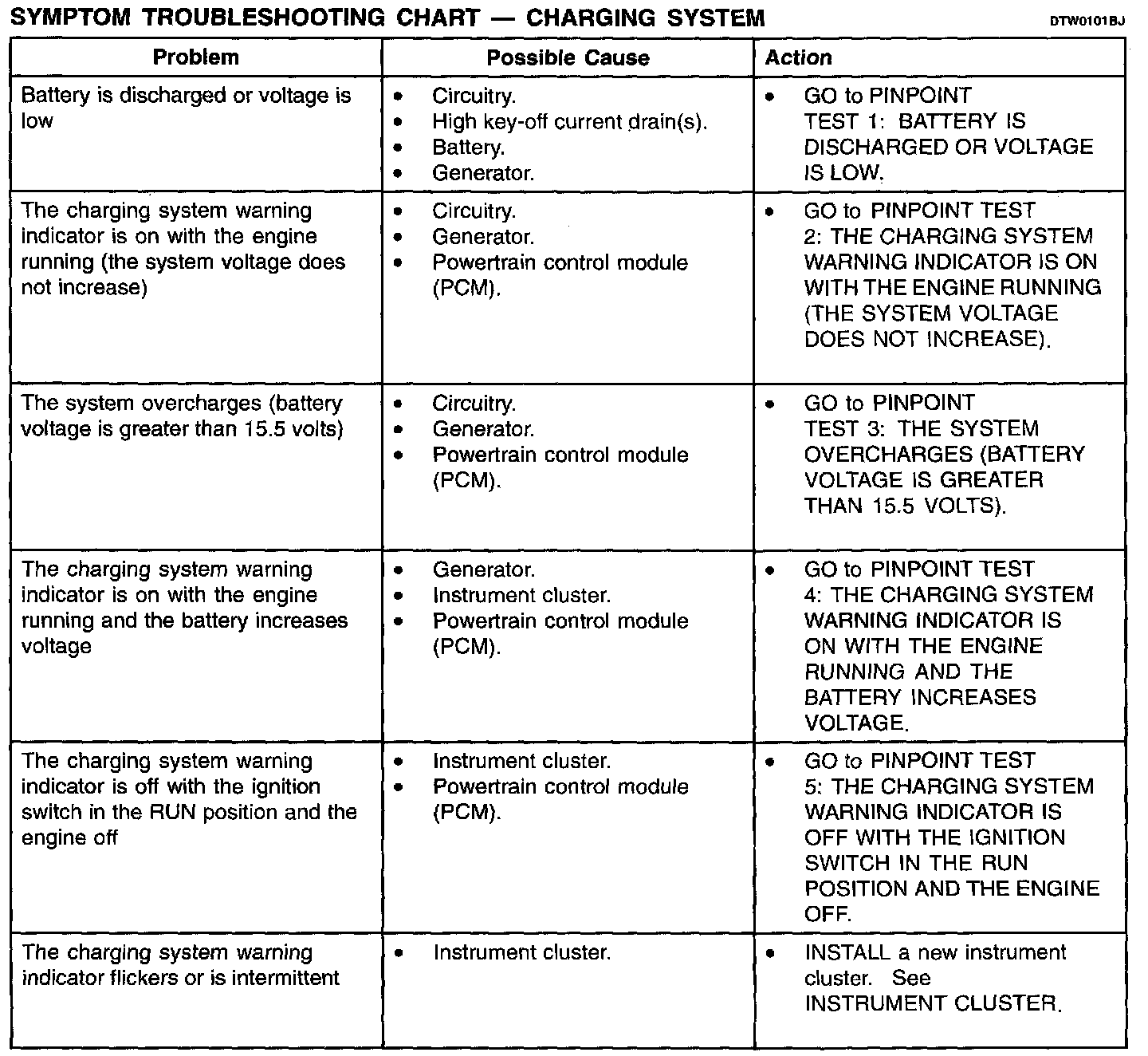 Symptom Troubleshooting Chart - Charging System Part 1: