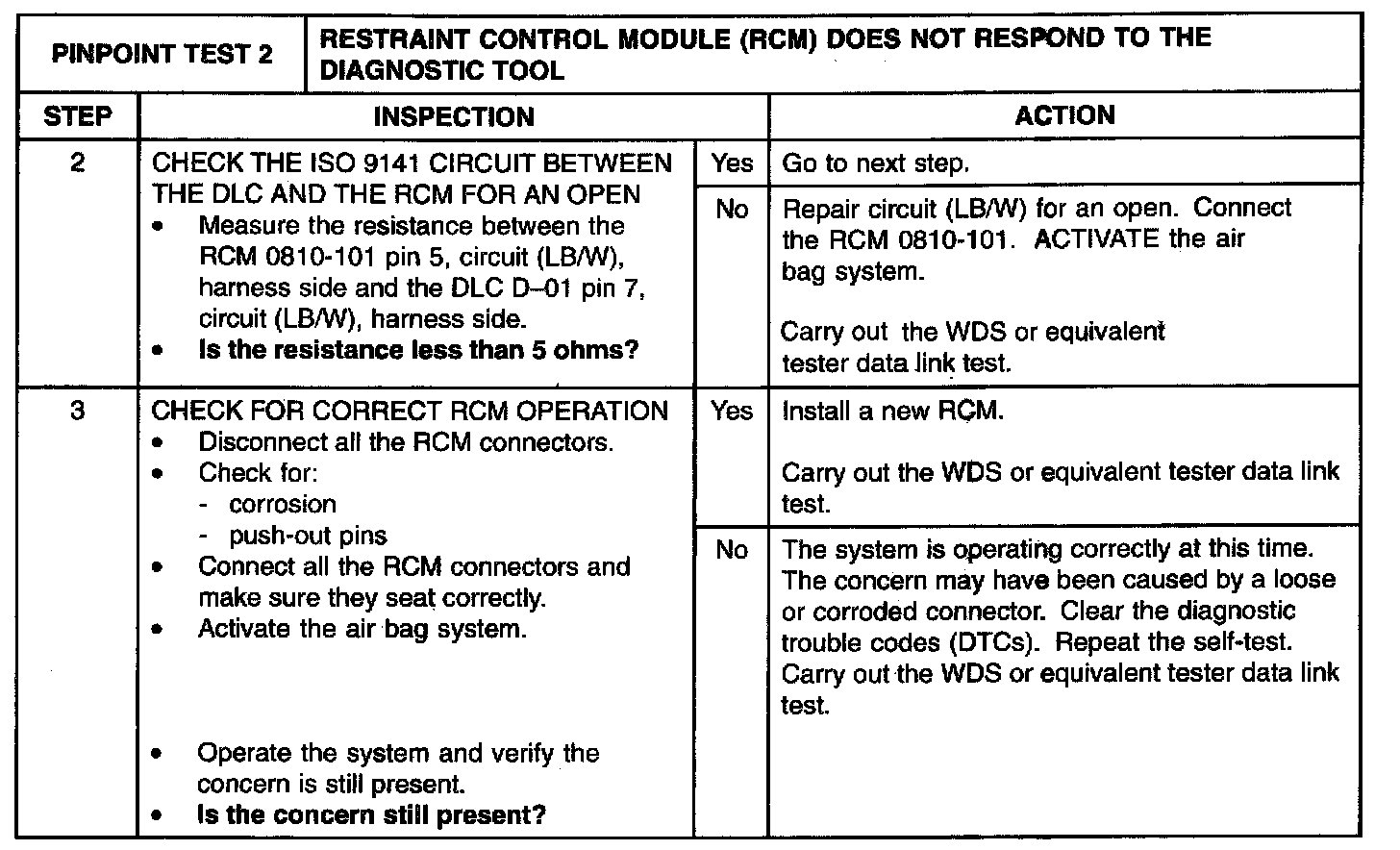 PINPOINT TEST 2: RESTRAINTS CONTROL MODULE (RCM) DOES NOT RESPOND TO THE DIAGNOSTIC TOOLNormal Operation