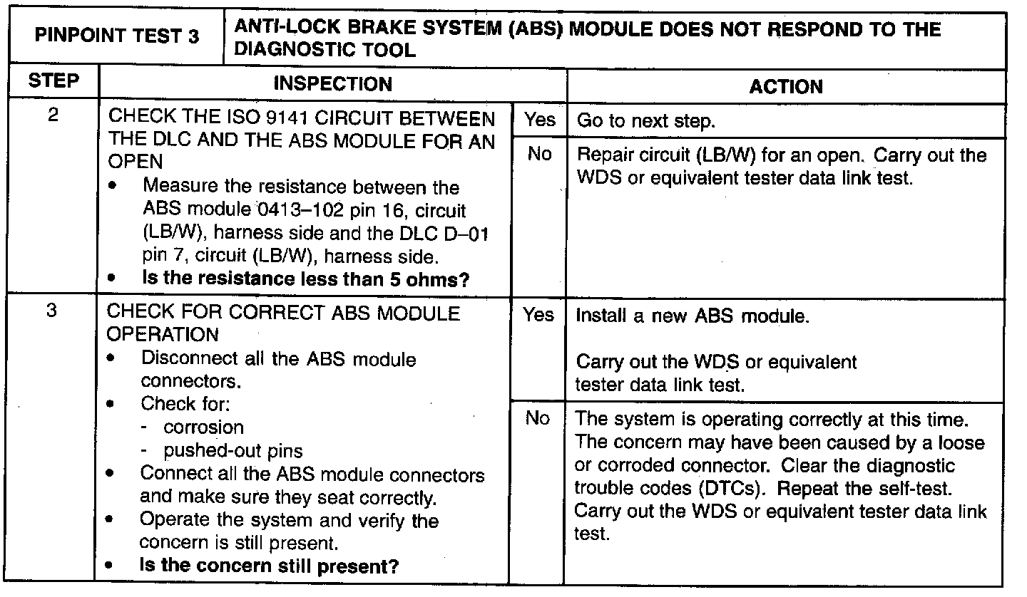 The ABS module communicates with the WDS or equivalent tester through the international standards organization (ISO) 9141 communication network circuit (LB/W). If circuit (LB/W) becomes open or shorted to ground communications to that module are not possible. Check circuit (LB/W) between the ABS module 0413-102 and the data link connector (DLC) D-01. The total resistance value must not be more than 5 ohms. If the resistance is more than 5 ohms, there is an open in circuit (LB/W), damage to the DLC D-01, or damage to the ABS module DLC.