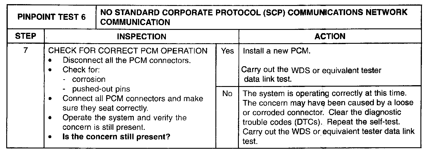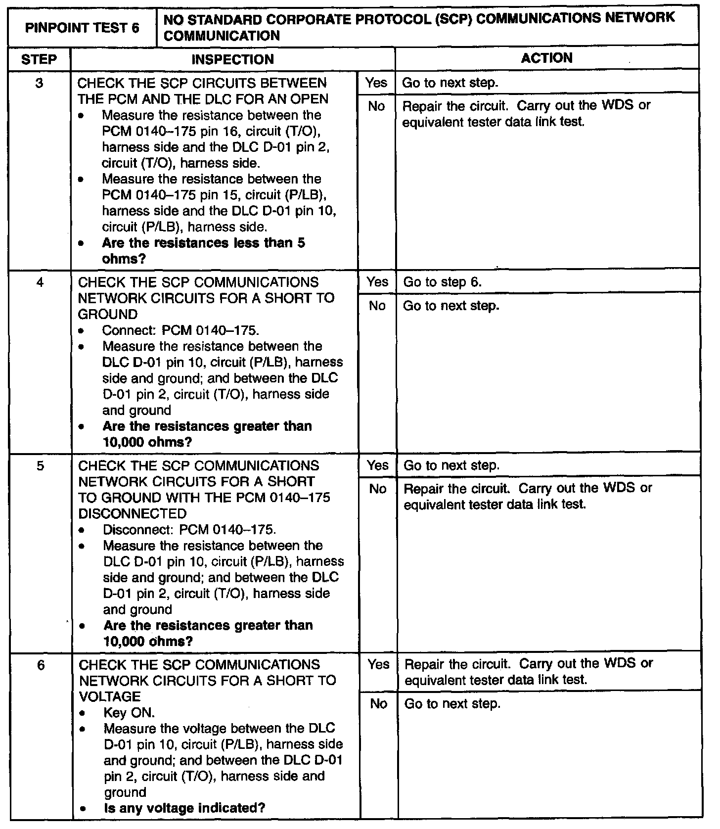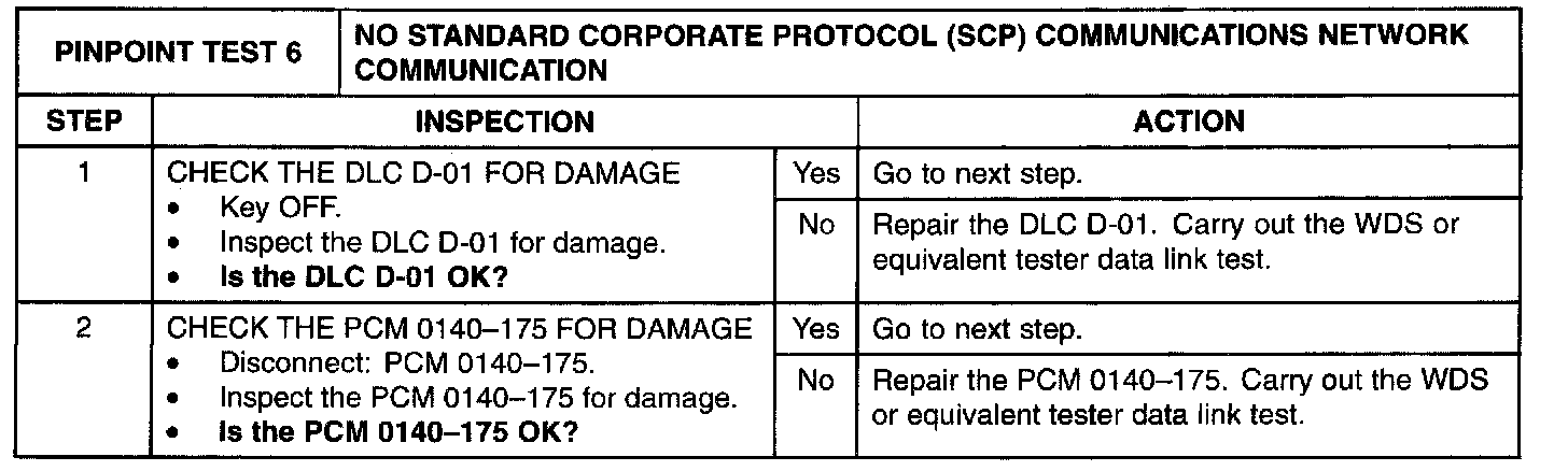 The powertrain control module (PCM) communicates with the WDS or equivalent tester through the SCP communications network circuits (T/O) and (P/LB). If one of the bus wires become shorted to ground or voltage communications can continue at a degraded level. Check the SCP communications network circuits between the PCM and the data link connector (DLC) D-01. The total resistance values must not be more than 5 ohms. If the resistance is more than 5 ohms, there is an open in one or both SCP communication network circuits, damage to the module connector, a problem with a in-line connector, or a problem with the DLC D-01. If, after individual checks of each circuit leading to a module show resistance values less than 5 ohms, and no in-line connector issues present.