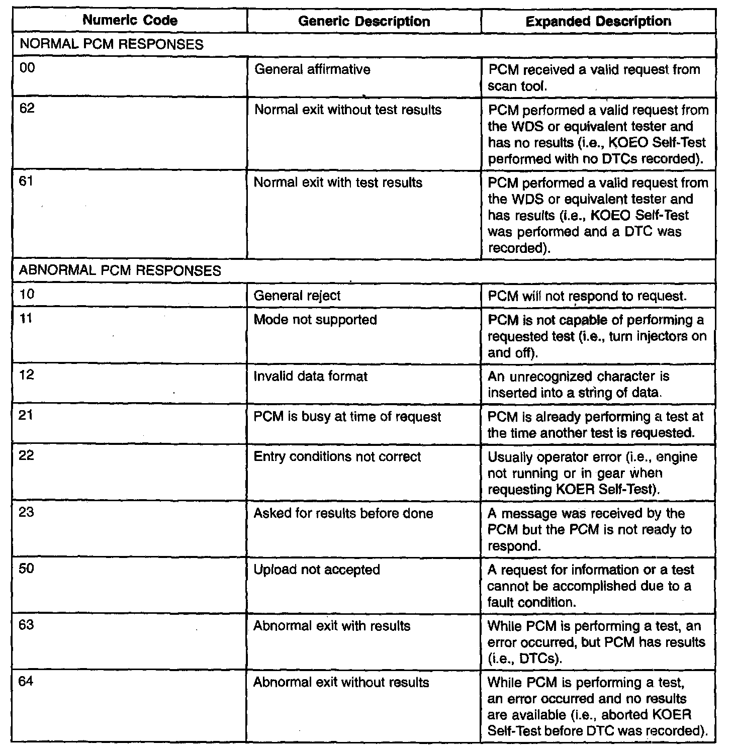 Communication ErrorIt is possible to receive a communication error from a WDS or equivalent tester when initiating a diagnostic test or accessing PIDs. The communication error can be caused by operator error, the vehicle wiring, connectors, the PCM or other control modules connected to the DLC wiring. The PCM will respond to a WDS or equivalent tester whenever the tool requests a test. These are not DTCs. Listed below are numeric codes and generic descriptions that a scan tool may display when trying to perform some PCM operations. It is possible to get other numeric codes not listed. For a complete list of communication response codes, see Society of Automotive Engineers (SAE) document J2190 enhanced E/E Diagnostic Test Modes. Some are normal responses to valid requests. The others are communication error responses.